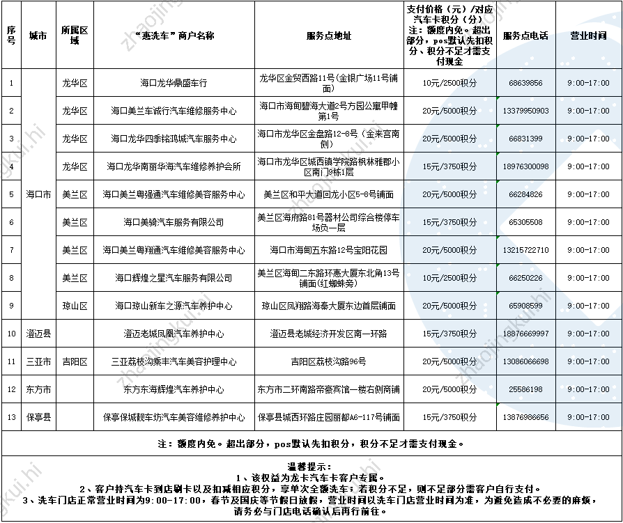 海南分行“惠洗车”商户服务网点信息表(信息更新时间:2025年12月12日)