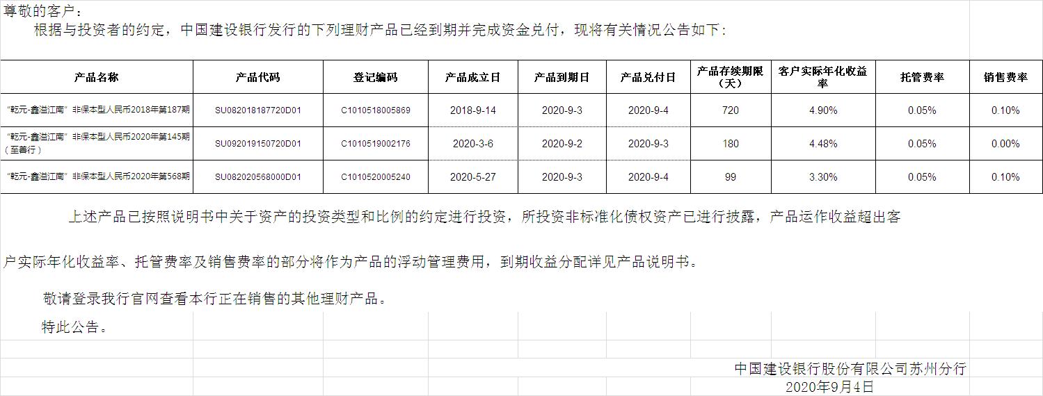中国建设银行理财产品终止及清算公告
